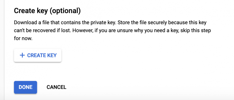 Upload a Service Account Key. Browse the JSON file previously created.