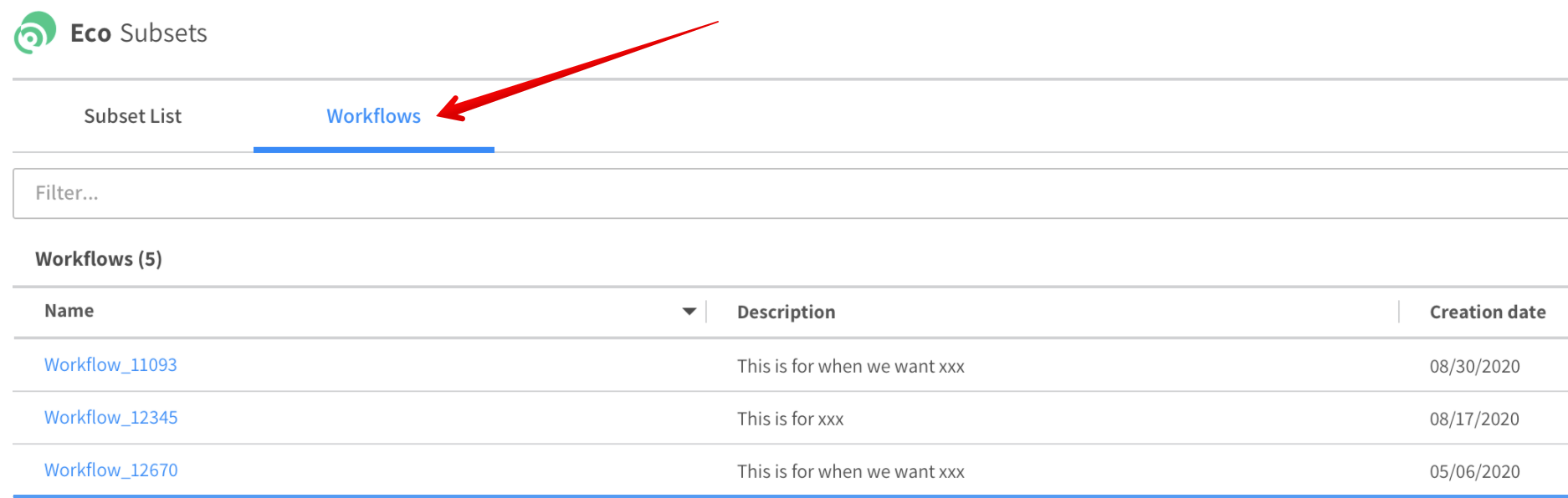 If you have a long list of workflows, you can use the filter above the list to find one or multiple workflows. Just enter a keyword or simply a string of text into the filter box and type enter.