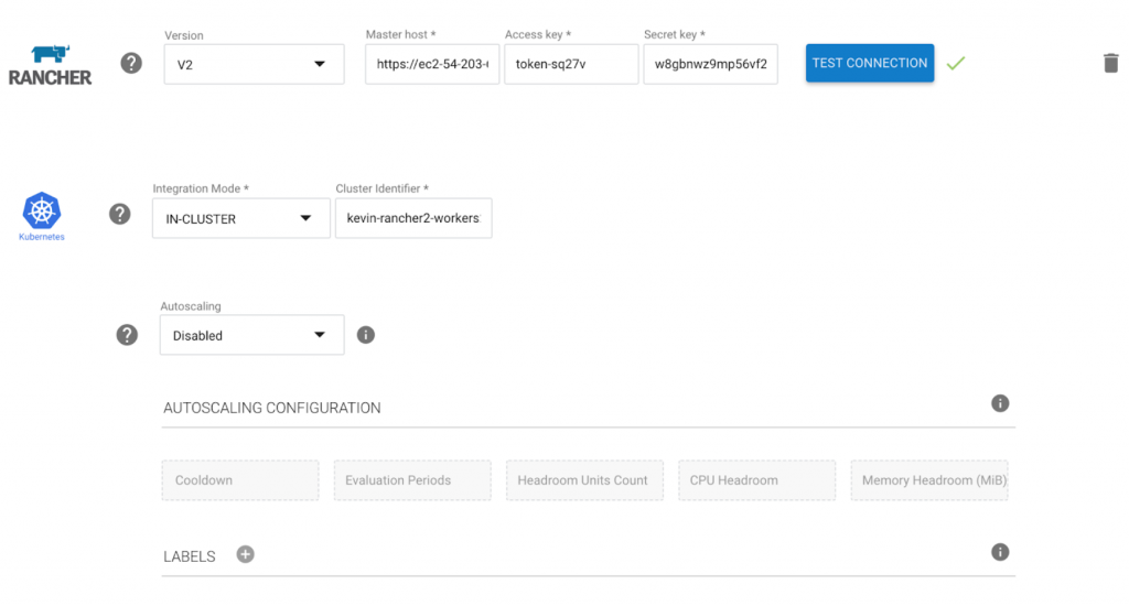 Once the userData is set, the next step is to configure the Rancher 2.0 Elastigroup integration. For Rancher 2.0+ Elastigroup needs to integrate with both the Rancher primary server as well as the underlying Kubernetes cluster.