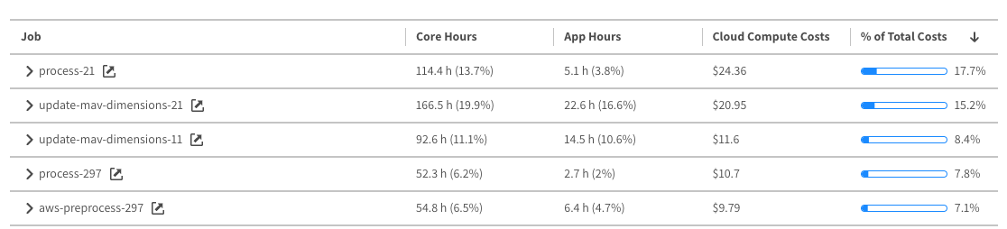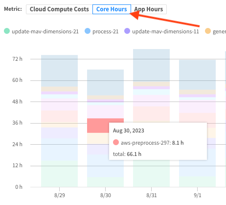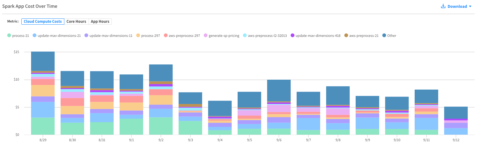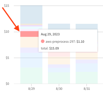 Cloud Cost is the default view (as shown in the example above). Each bar in this chart shows the cost broken down into jobs. Each color in the bar represents a job. You can hover your mouse over the different colors in a bar to see information about each job.