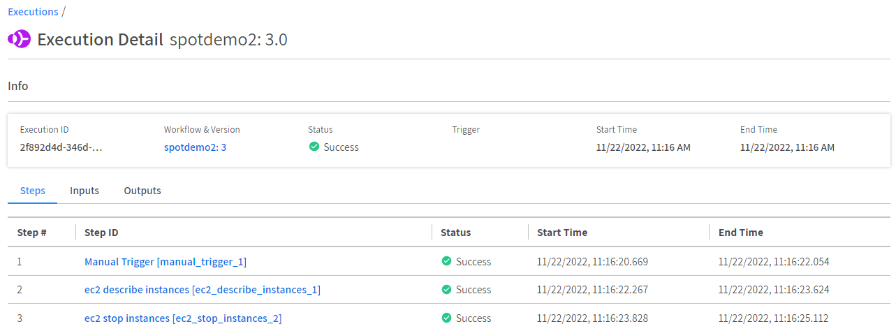 You can view the executions you created in the Execution Detail page after you have successfully run your workflow.